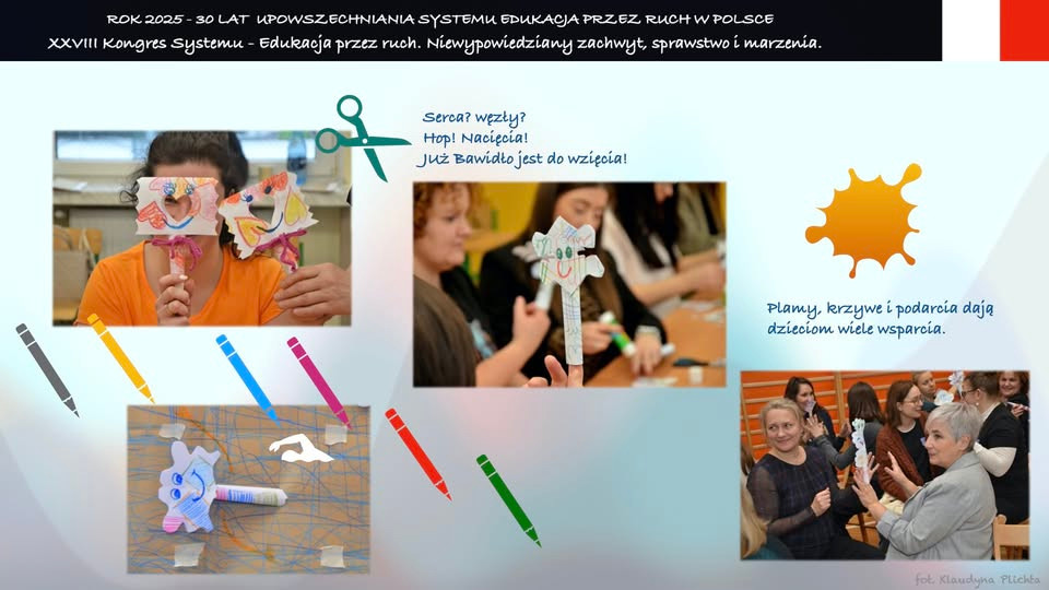 Dnia 11 stycznia 2025 roku w Warszawie Publiczne Przedszkole 8 „Plastuś” reprezentowane przez grono pedagogiczne oraz Panią dyrektor Annę Lodowską uczestniczyło w XVIII Kongresie systemu Edukacja przez Ruch. Był to wyjątkowy, bo jubileusz XXX lecia powstania i upowszechniania tej polskiej metody pracy. Przedszkole jest czwartą placówką oświatową w Polsce mającą certyfikat przedszkola pracującego tą systemową metodą, którego twórczynią jest Pani Dorota Dziamska. Tego dnia nasze przedszkole otrzymało przywilej przekazania certyfikatu kolejnej placówce w Polsce, Szkole Podstawowej 225 w Warszawie im. Jana Bożka. Pani dyrektor Anna Lodowska jako trener wykładowca EPR i nauczyciele naszego przedszkola pracujący tą wyjątkową autentyczną metodą z dziećmi otrzymało potwierdzenie wysokiej jakości pracy z dziećmi i utrzymało w mocy nadany certyfikat z rąk Pani Doroty Dziamskiej. Jest to przywilej i odpowiedzialność nauczycieli by stosować tę metodę w codziennej pracy z dziećmi podnosząc aktywność poznawczą dziecka każdego dnia we wszystkich obszarach rozwoju dziecka. Na stronie FB i na stronie internetowej placówki można obejrzeć projekty w których przedszkole uczestniczy w ramach tej metody np. Nasze Epopeja „Pan Tadeusz” i zapoznać się z efektami pracy podziwiając dzieła małych rak.