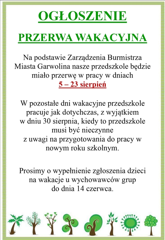 ZARZĄDZENIE_BURMISTRZA_MIASTA_GARWOLIN ...Czytaj więcejPrzejdź do pełnej zawartości artykułu: PRZERWA WAKACYJNA W PRZEDSZKOLU "PLASTUŚ"