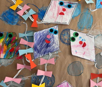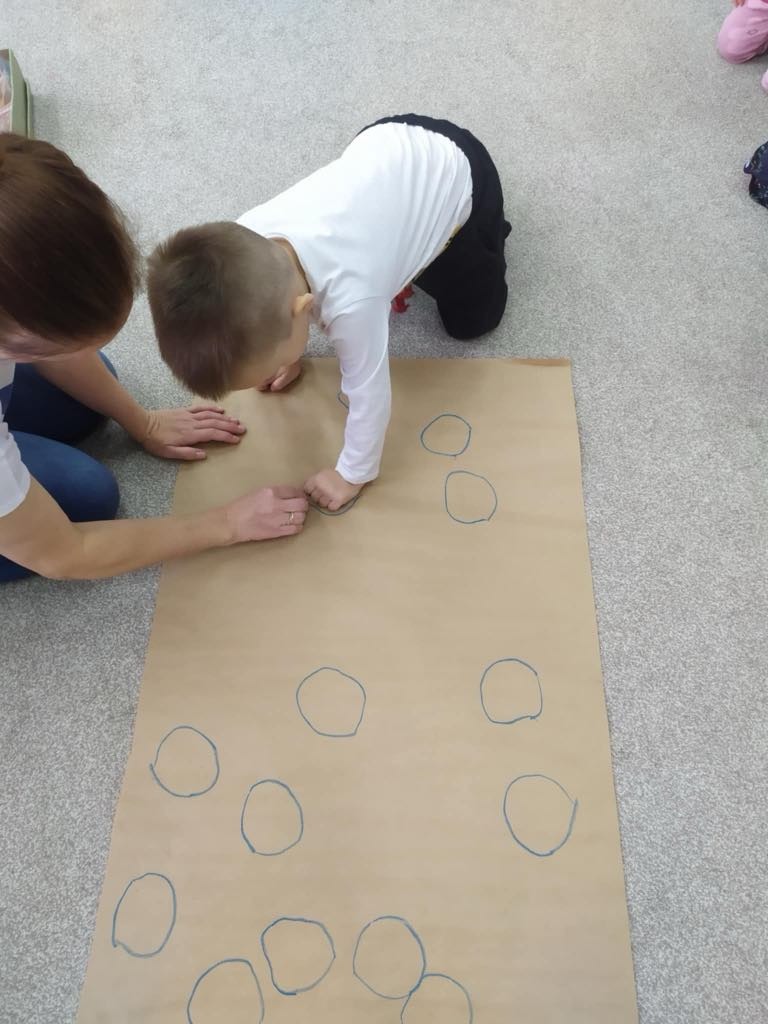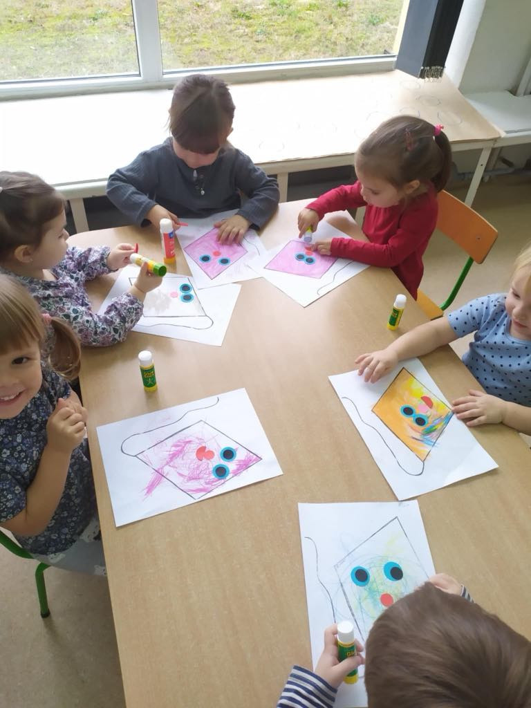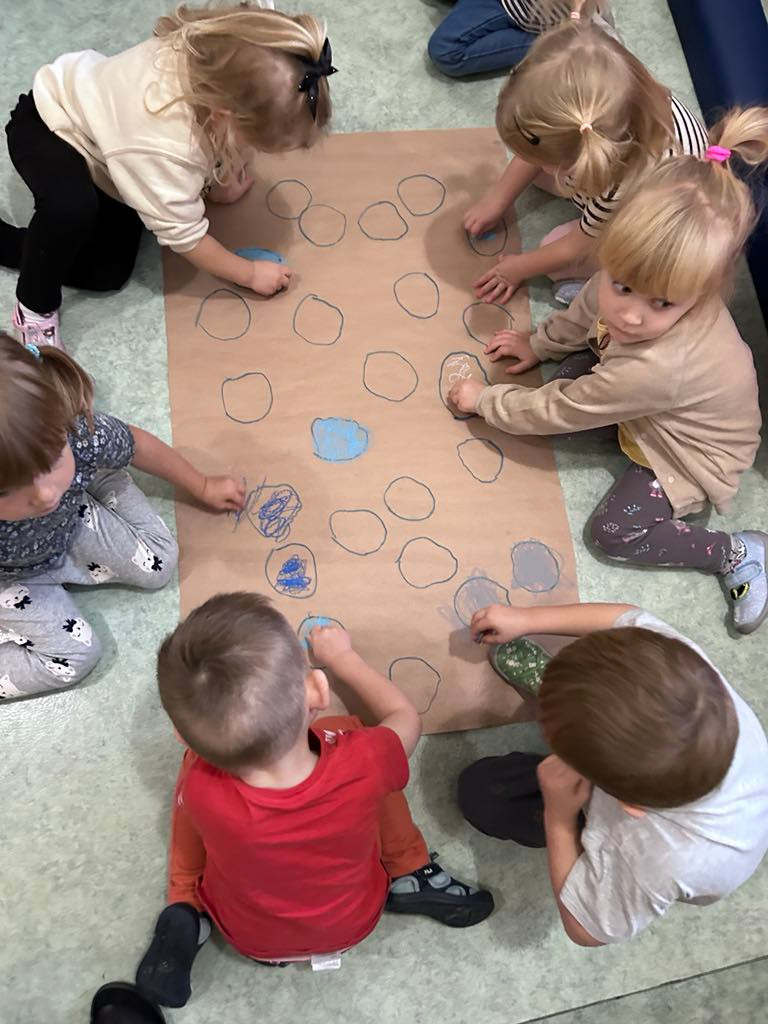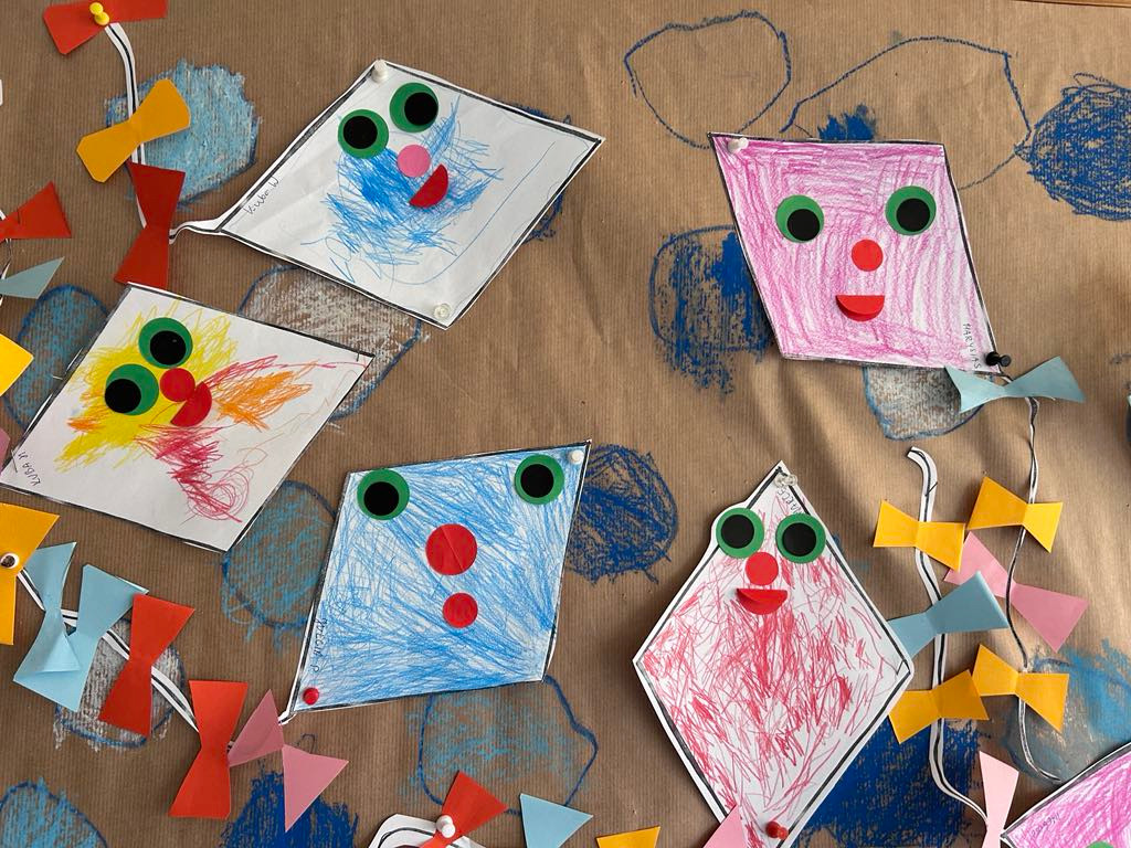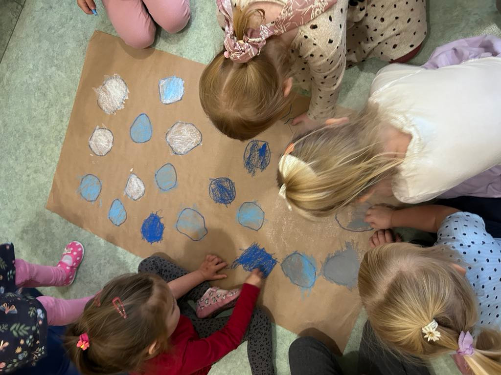 PRZEDSZKOLAKI WYKONAŁY RÓWNIEŻ KOLOROWE LATAWCE, KTÓRE ZAWISŁY WŚRÓD CHMUREK ZROBIONYCH Z ODRYSOWANYCH PIĄSTEK – TO NASZE PIERWSZE ZABAWY SYSTEM EPR – „PIĄSTECZKA A Z NIEJ POWSTAJE CHMURECZKA”.