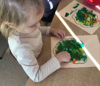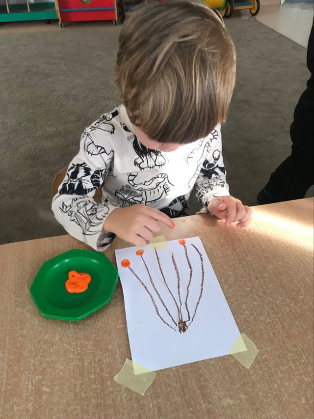 Malowała jesień w parku wszystkie liście… jesień zawitała do grupy „Krasnali”. Dzieci miały okazję poznać najpiękniejsze oblicze jesieni i jej dary: kasztany, żołędzie, jarzębinę oraz piękne kolorowe liście. Uczyły się nazw drzew i ich owoców. Dowiedziały się, że nie wszystkie drzewa mają liście, są też drzewa iglaste. Na dywanie układały rytmy z liści- to trudne zadanie dla dzieci, ale wspólnie daliśmy radę, powstał piękny szal dla Pani Jesieni. Dzieci przez lupę oglądały liście, igły świerku, owoce jarzębiny. Stemplowały gąbką koronę drzewa, a systemem Edukacja przez Ruch powstała piękna gałązka jarzębiny.