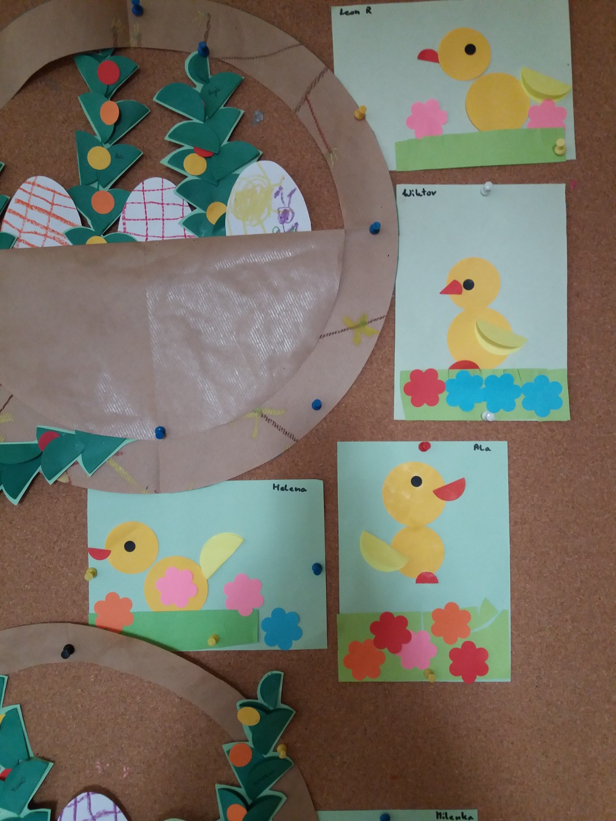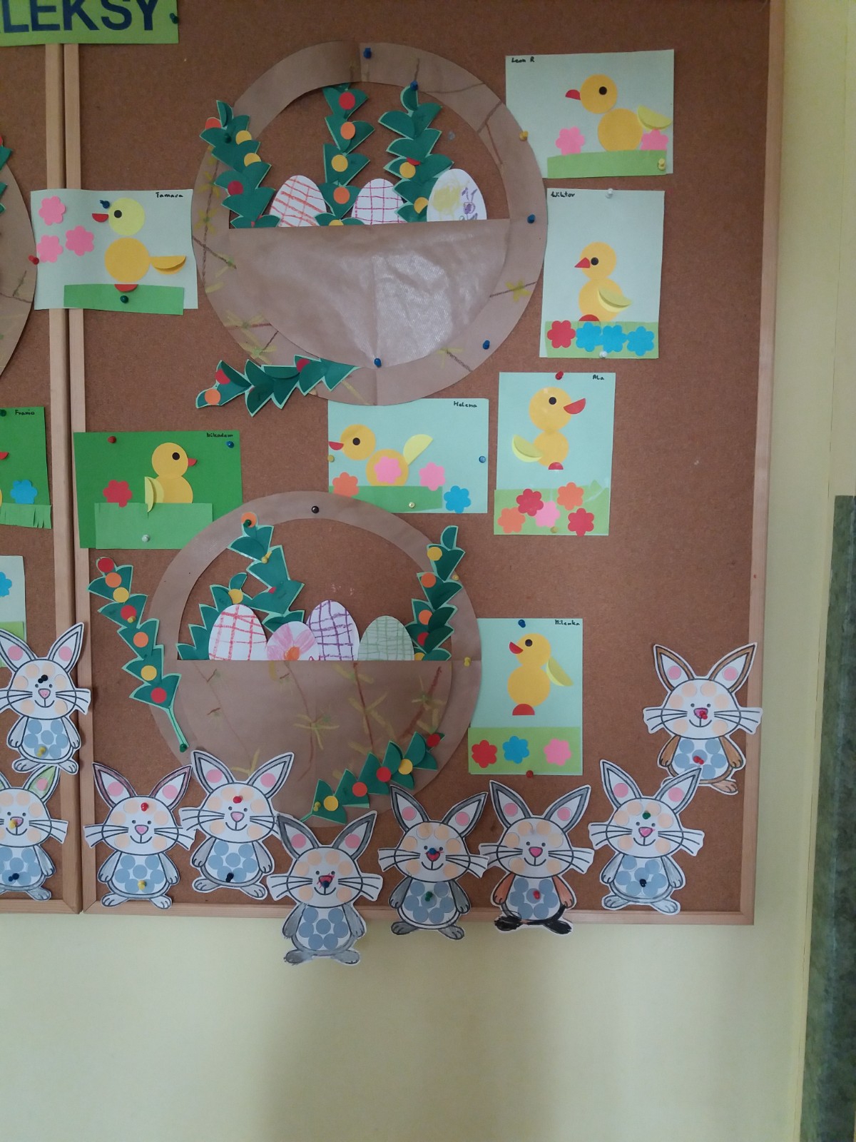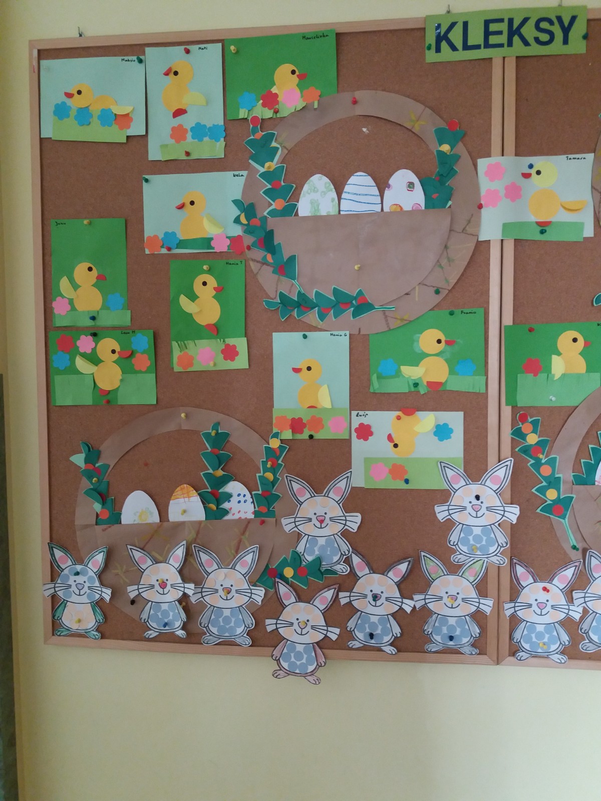 Na naszej tablicy powstała z prac dzieci „Wielkanocna kartka”, na której pojawiły się: koszyczki z gałązek forsycji, palmy z kół origami, kolorowe pisanki z zabaw grafomotorycznych, zajączki kodowane z kół, małe kurczaki z gry terenowej.