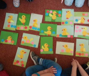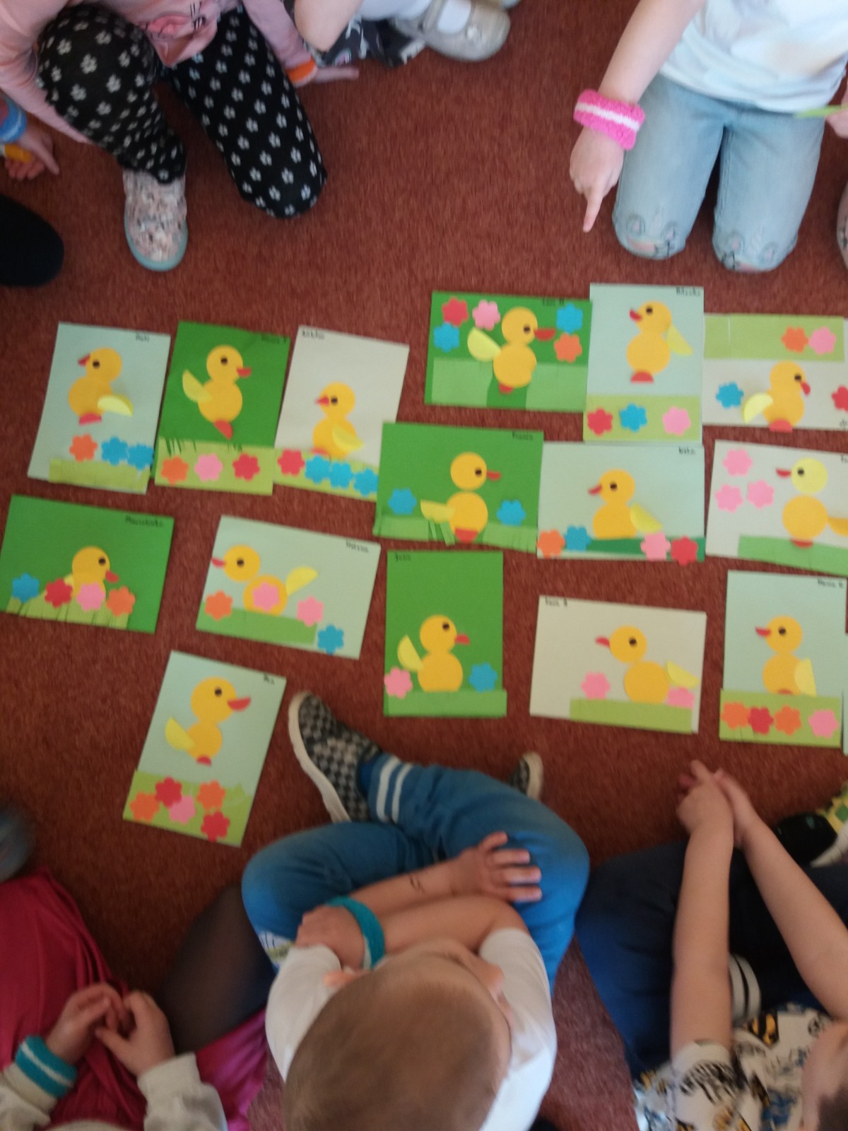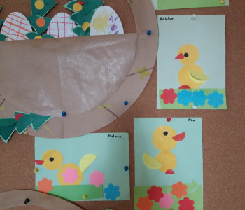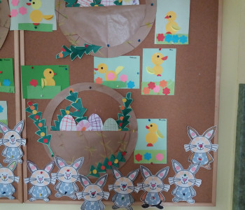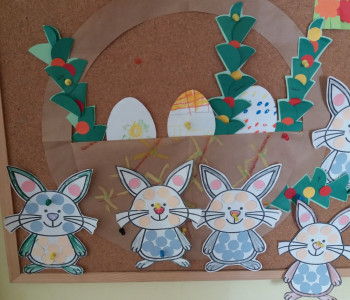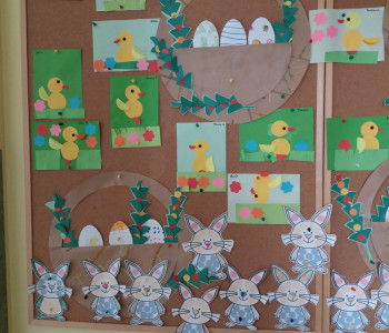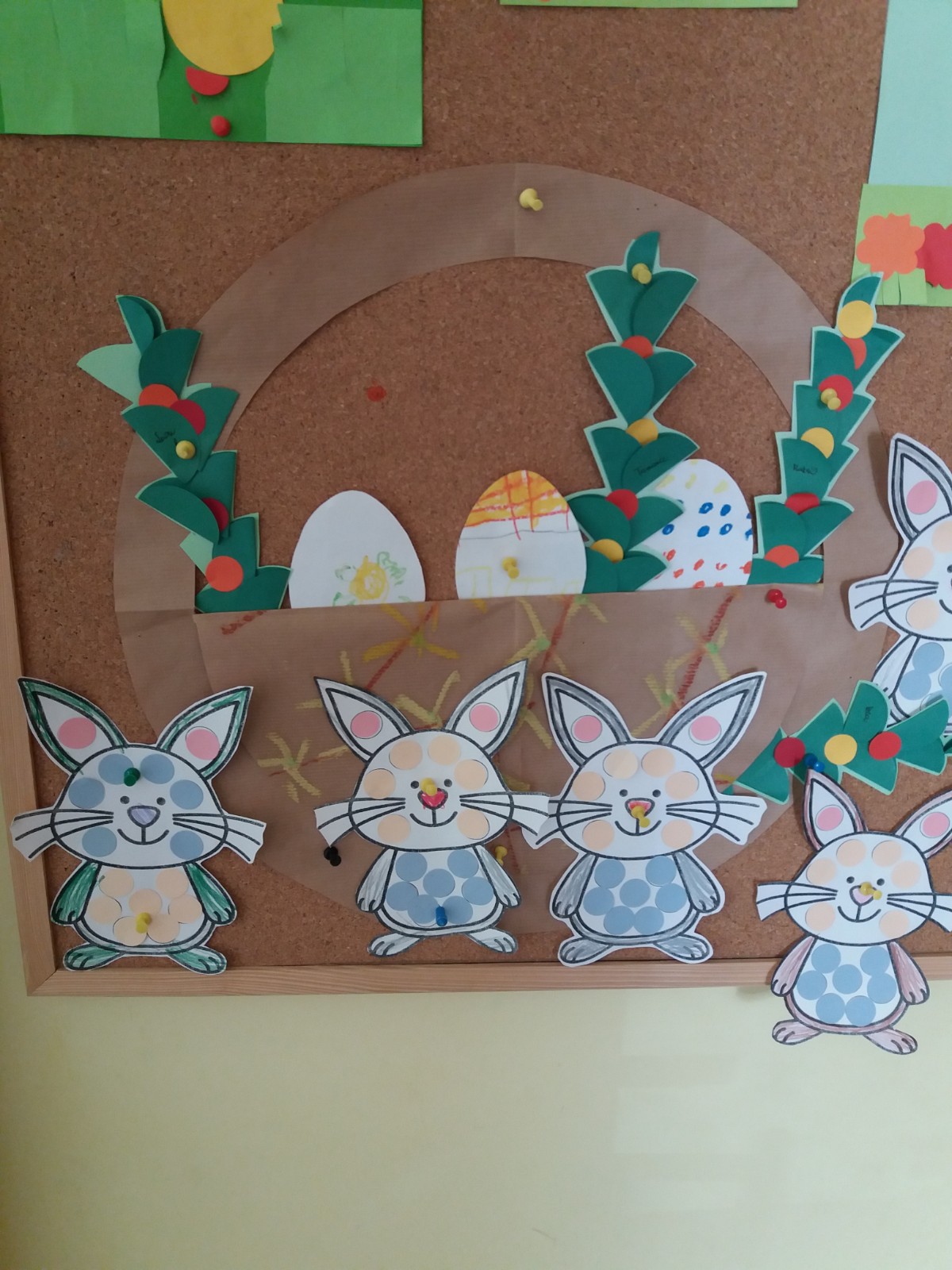 Na naszej tablicy powstała z prac dzieci „Wielkanocna kartka”, na której pojawiły się: koszyczki z gałązek forsycji, palmy z kół origami, kolorowe pisanki z zabaw grafomotorycznych, zajączki kodowane z kół, małe kurczaki z gry terenowej.