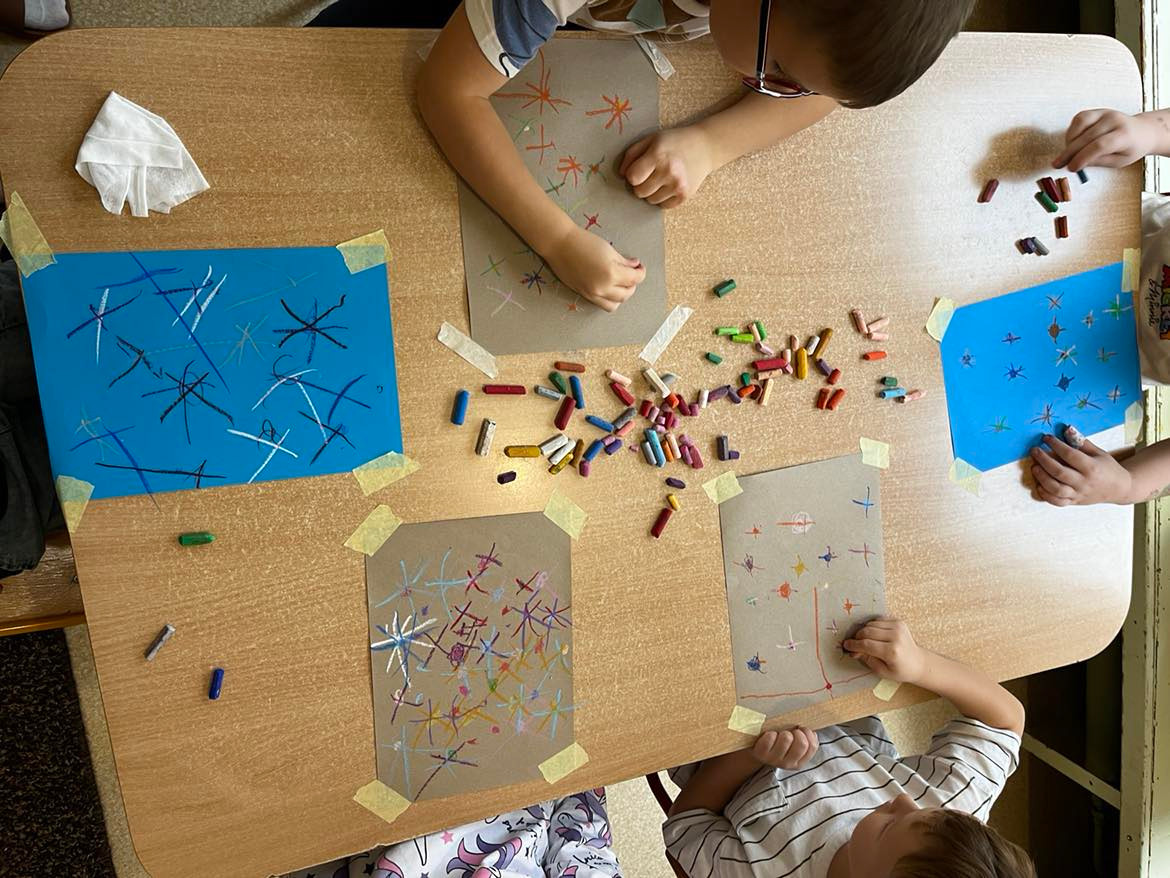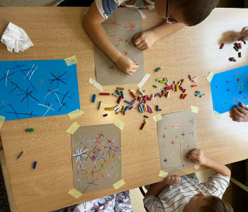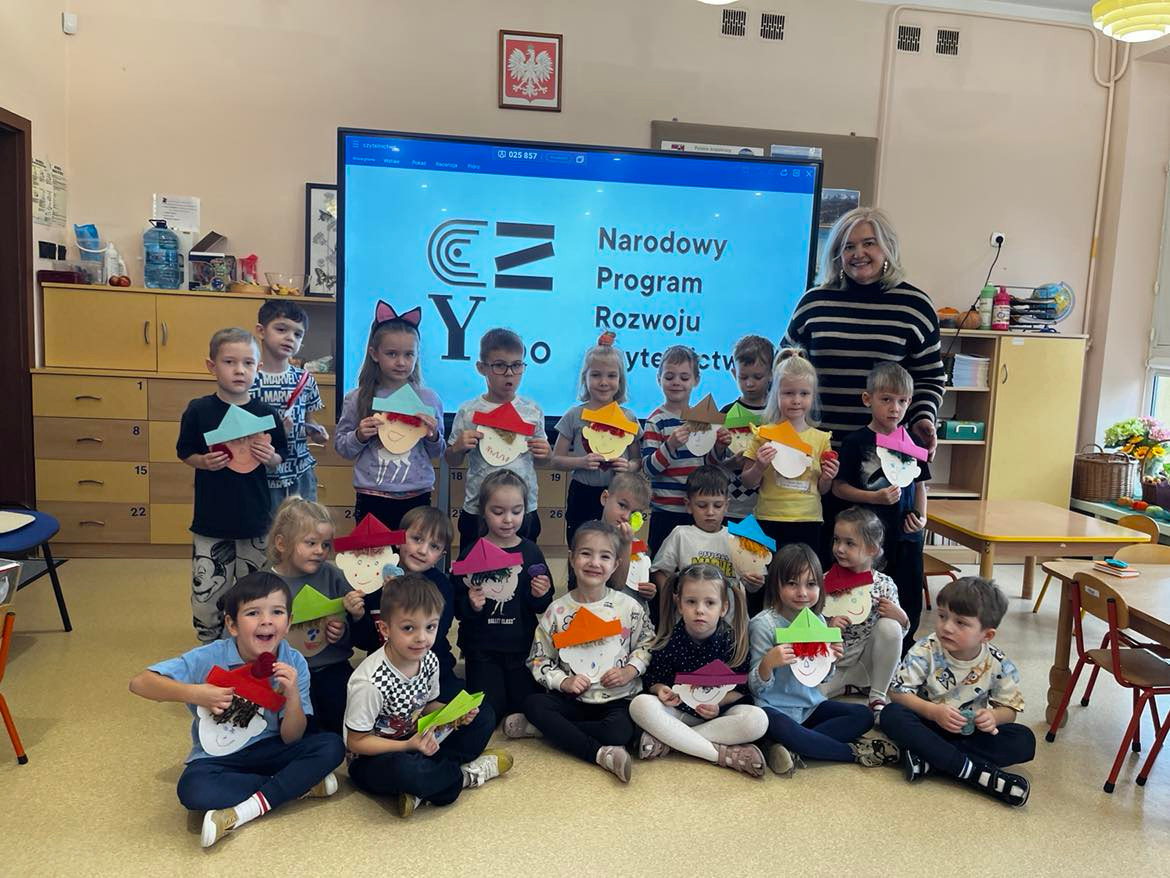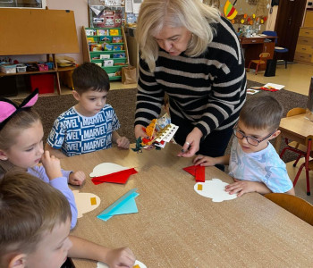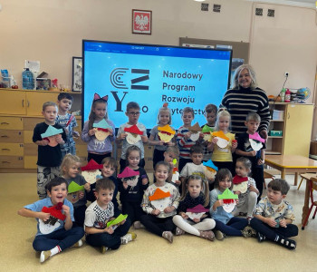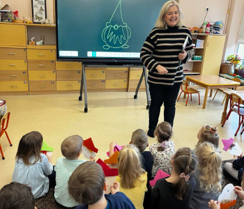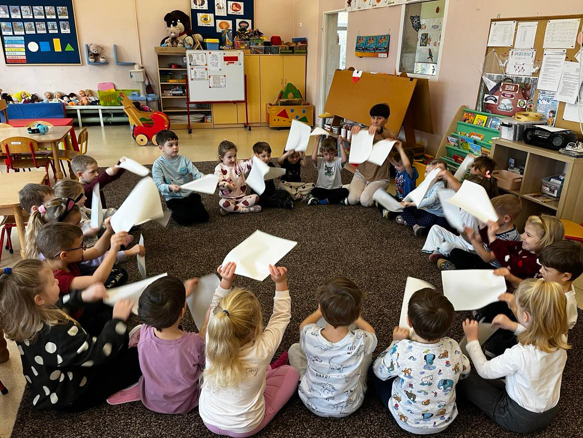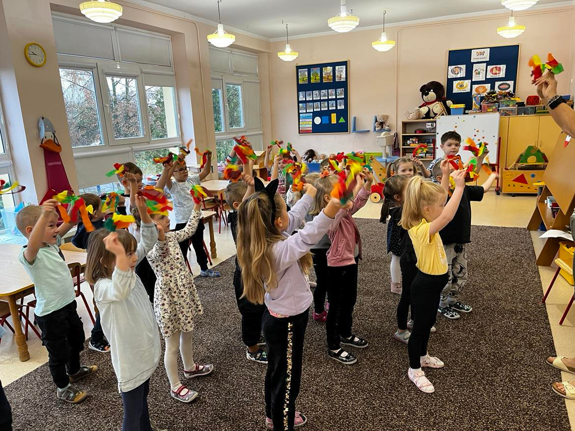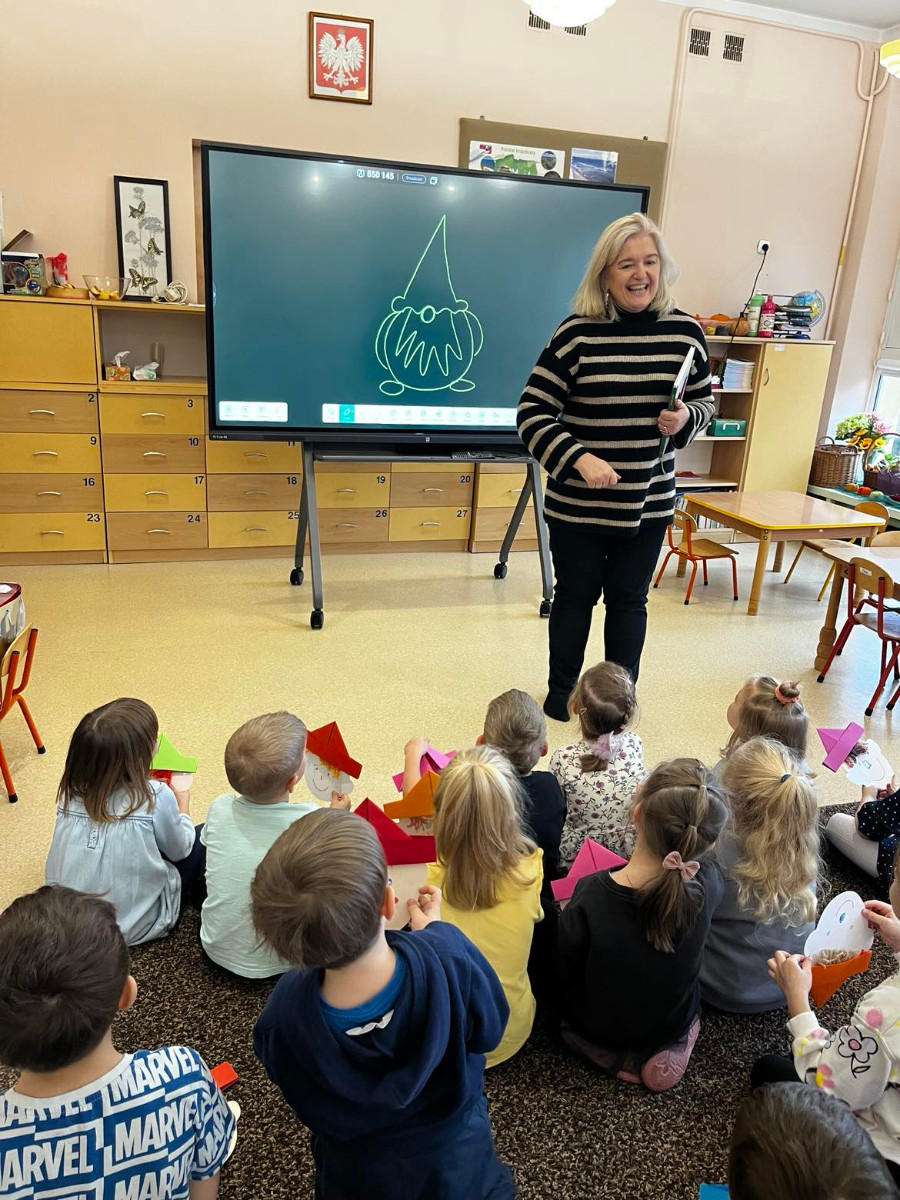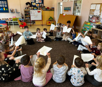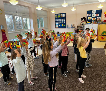 W tym tygodniu rozmawialiśmy o wietrze. Sprawdzaliśmy czy wiatr idzie zobaczyć, czy idzie go poczuć oraz w którą stronę wieje. W ramach różnych zajęć: muzycznych, ruchowych czy naśladowczych Ufoludki poszerzyły swoją wiedzę na temat wiatru. Dzieci opowiadały co to jest wiatr, jakie mogą być rodzaje wiatru, jak można go wywołać oraz jakie ma oddziaływanie w przyrodzie. Podczas ćwiczeń oddechowych maluchy samodzielnie wywoływały wiatr, dmuchając na piórka buzią. Stworzyliśmy jesienny pejzaż elementami metody Edukacja przez Ruch. W tym tygodniu odwiedził nas wyjątkowy gość – autorka książki „Wierszyki rysowanki dla Franki’’ Pani Małgorzata Spilarewicz. Ufoludki były zachwycone spotkaniem. Pani Małgorzata zaciekawiła Ufoludki swoim wierszem, tworząc w prosty sposób sympatycznego krasnala na tablicy multimedialnej. Wspólnie z naszym gościem dzieci wykonały ciekawe prace. Na koniec spotkania każde dziecko otrzymało ręcznie wykonane prezenty od Pani Małgorzaty.]