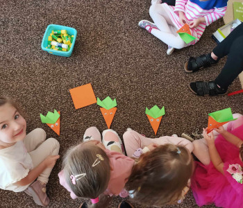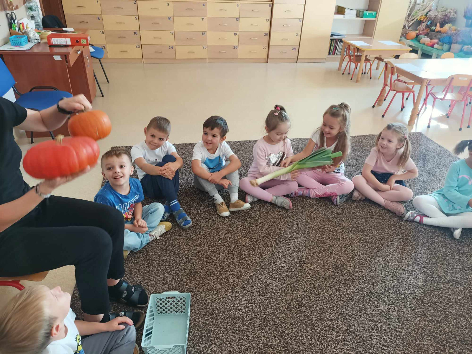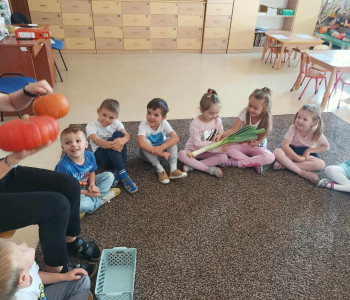 Dzieci mogły zobaczyć, dotknąć, powąchać i spróbować warzywa co pozwoliło im łatwiej zapamiętać nowe wiadomości. Utrwaliliśmy nazwy warzyw i owoców, dzieliliśmy je na kategorie. Następnie rozmawialiśmy o tym, jak ważne jest ich spożywanie dla zdrowia człowieka.