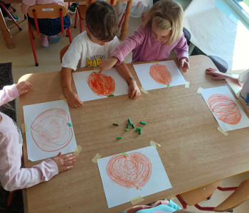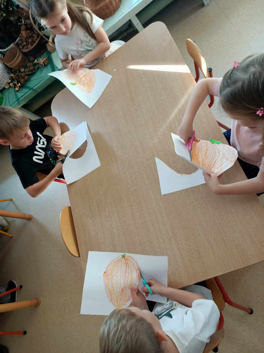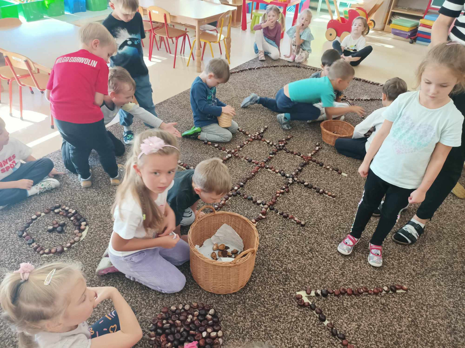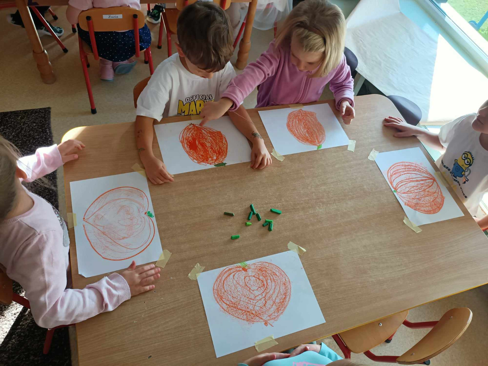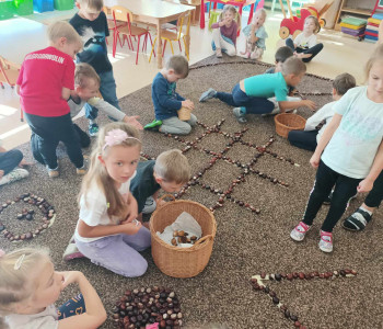 Ufoludki obejrzały prezentację wiersza „Na straganie” J. Brzechwy z ilustracjami. Poznały budowę warzyw, dzieliły na sylaby nazwy warzyw. Wykonały prace plastyczne - „Dynię” z elementami Edukacji przez ruch oraz marchewkę elementami origami , które można podziwiać na naszej plastycznej wystawce. Układaliśmy warzywne sudoku na dywanie. Dużo frajdy sprawiło dzieciom układanie kasztanowych wzorów na taśmie malarskiej. Na zakończenie tygodnia nie mogło zabraknąć ćwiczeń gimnastycznych z elementami sensoryki.