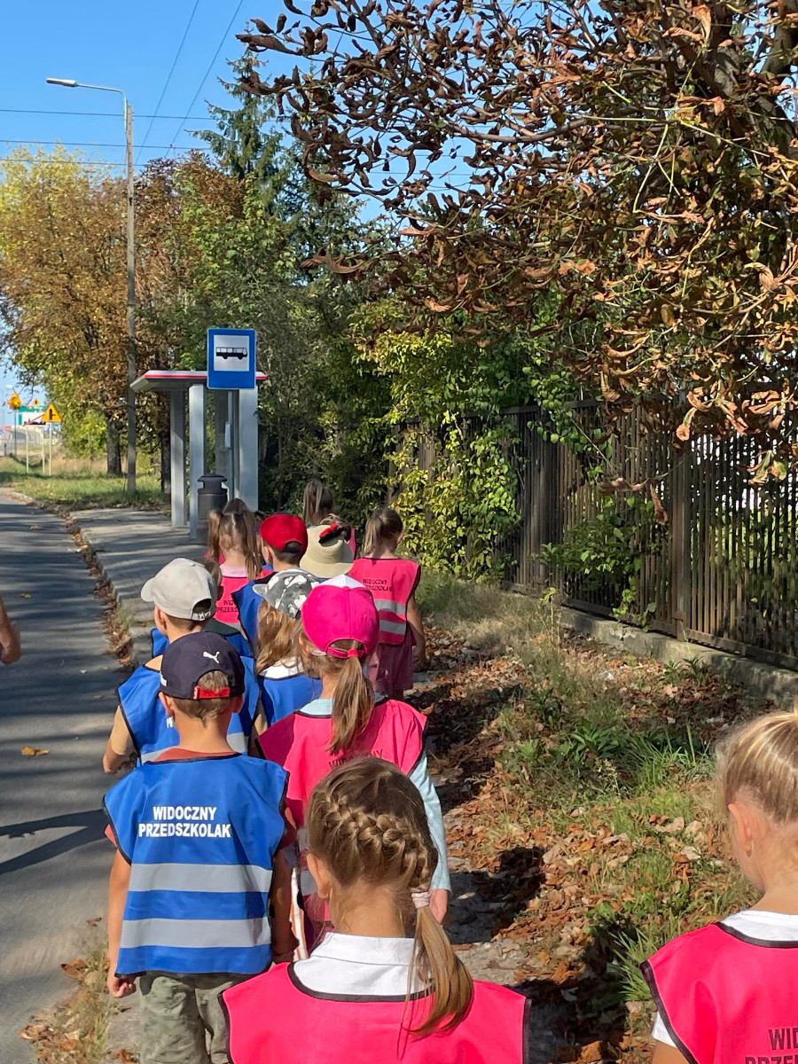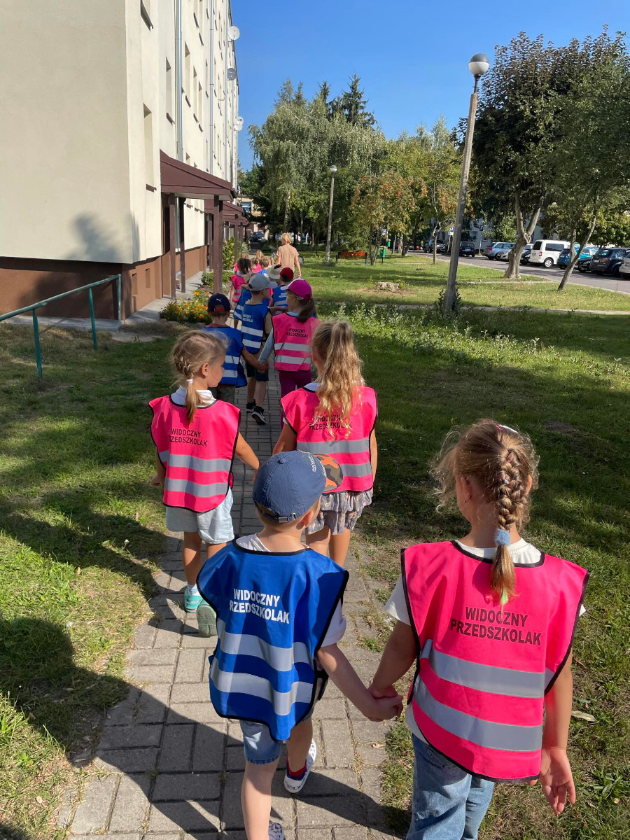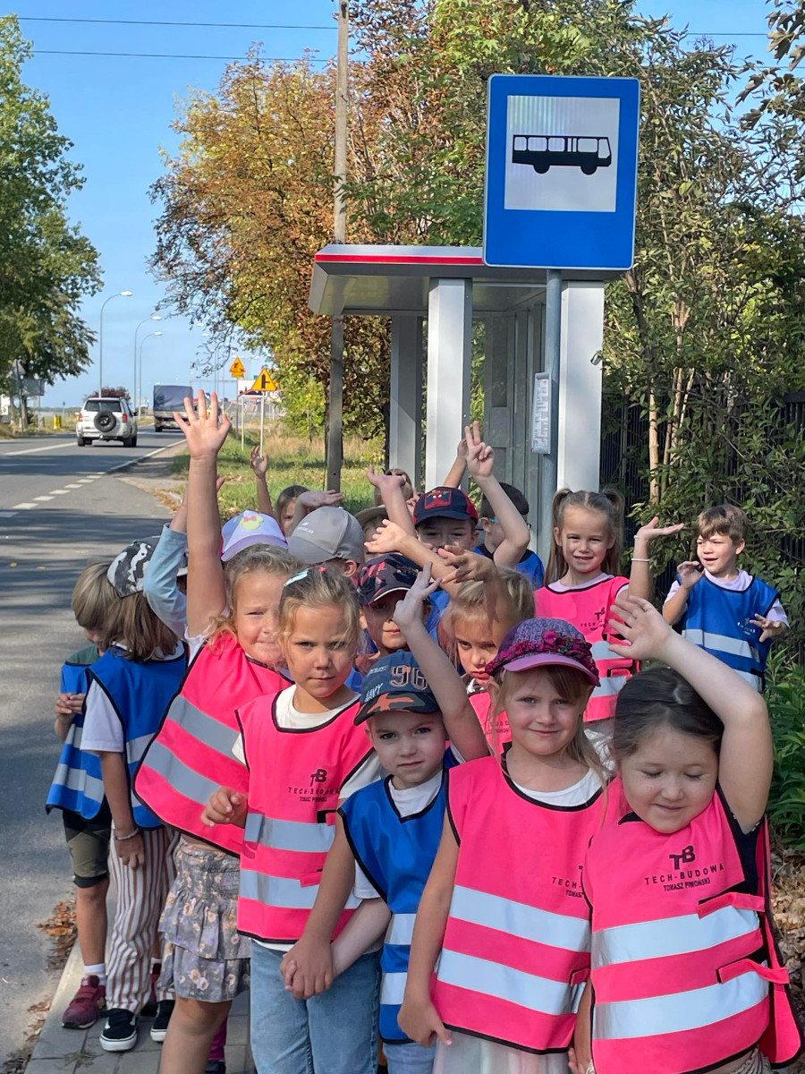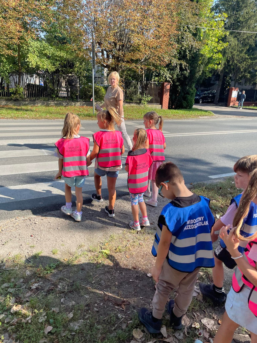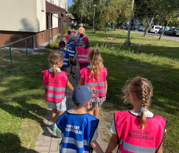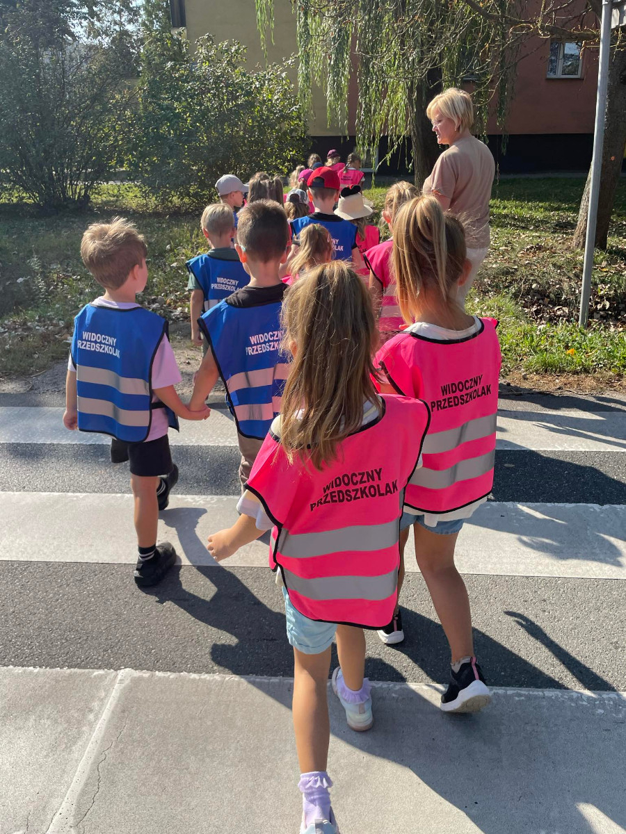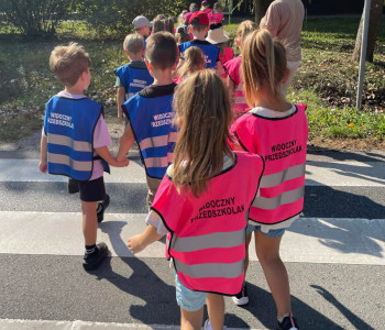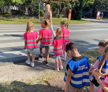 Podczas wycieczki na pobliskie przejście dla pieszych w minionym tygodniu dzieci z grupy „Plastelinki” omawiały temat dotyczący ruchu drogowego. Wiedzę zdobytą na zajęciach postanowiły zastosować w praktyce podczas wycieczki w pobliżu swojego przedszkola. Przed wyjściem przedszkolaki przypomniały sobie, jak należy zachować się na drodze. Dla bezpieczeństwa założyły kamizelki. Podczas wycieczki wszyscy obserwowaliśmy poznane znaki drogowe, uczyliśmy się jak prawidłowo grupą przechodzić na pasach przez jezdnię. To była bardzo pouczająca wycieczka.