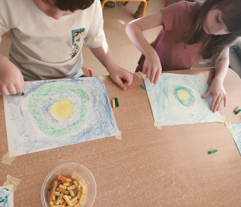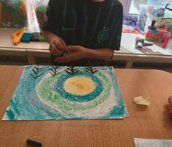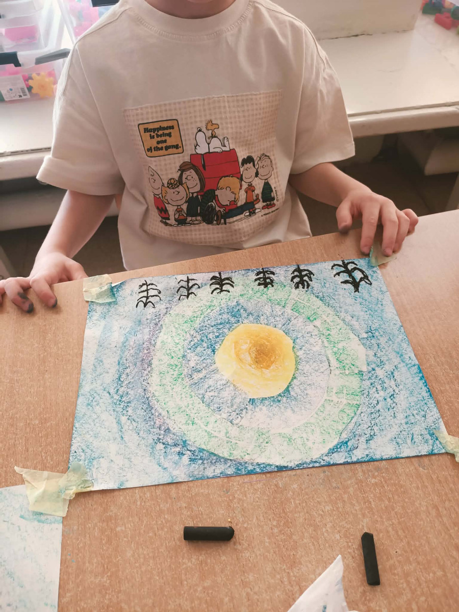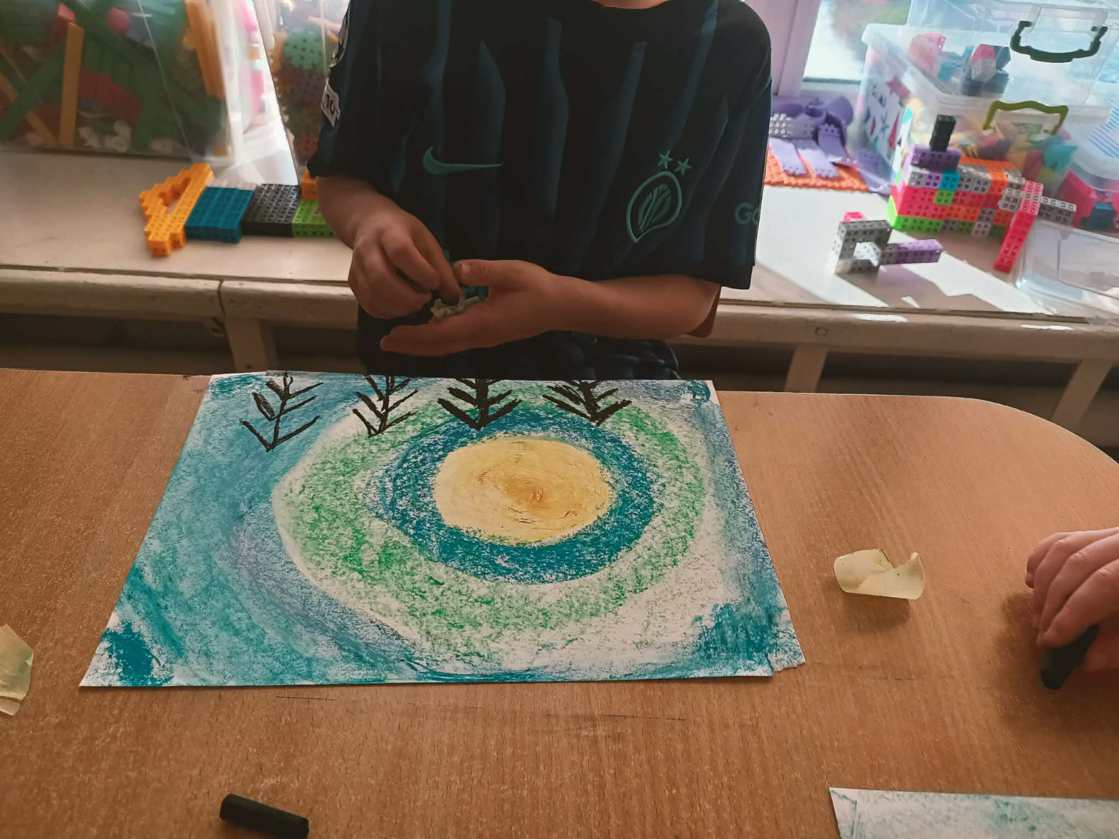 W tym tygodniu oprócz tematyki zdrowia poznaliśmy kolejne litery oraz bawiliśmy się i liczyliśmy z cyfrą 5. Nie zapomnieliśmy w zabawach i piosenkach o uroczej porze roku czyli zimie. Przy okazji poznaliśmy nowe niezwykłe zjawisko przyrodnicze, które można zaobserwować na niebie w pobliżu biegunów Ziemi – czyli zorza polarna, która powstaje wtedy, gdy cząsteczki ze Słońca spotykają się z atmosferą naszej planety, tworząc barwne światła tańczące na nocnym niebie. Inspiracją do zajęć plastycznych stała się właśnie zorza polarna. Dzieci, wykorzystując pastele tworzyły własne, kolorowe interpretacje tego zjawiska.