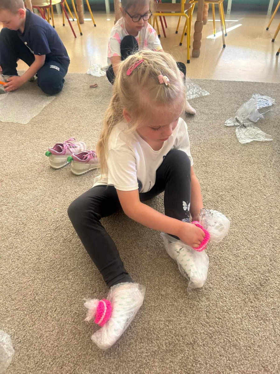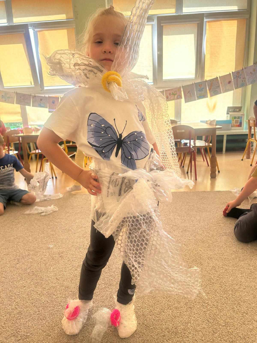 Folia bąbelkowa, zalety której odkrywaliśmy w tym tygodniu, to bardzo wdzięczny materiał podczas zabaw sensoryczno- artystycznych, a jej ciekawa „kropeczkowa” faktura sprawdza się w kreatywności. My pobudzając swoją wyobraźnię: ściskaliśmy i ugniataliśmy kuleczki, by usłyszeć jej specyficzny szelest i pękanie. Ogromną frajdę sprawiło nam chodzenie po niej i owijanie się w „kokon”. Nasz artystyczny zmysł znalazł ujście podczas tworzenia strojów na pokaz mody oraz malowania folią krzewów bzu.